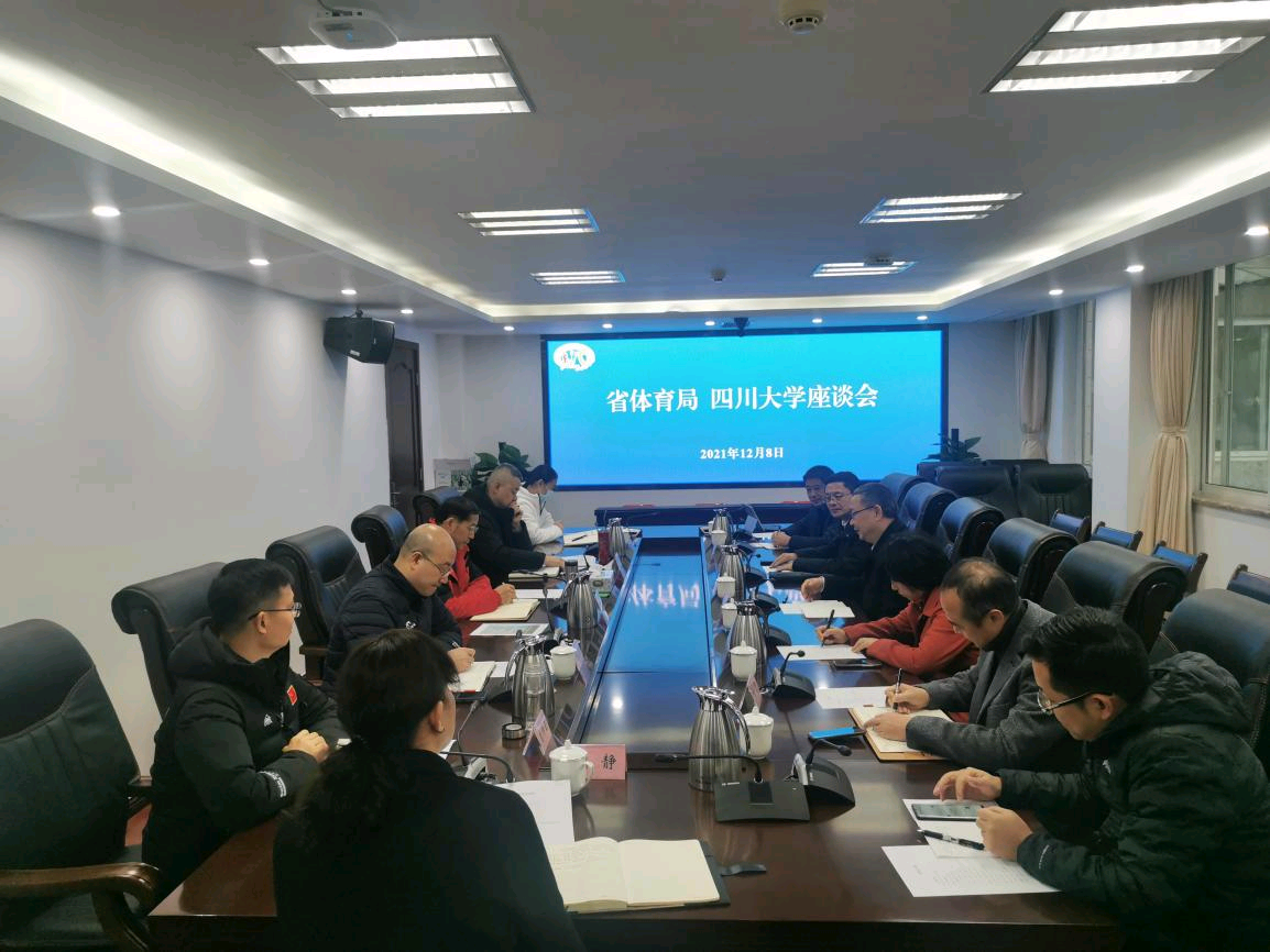 2021年12月8日上午,梁斌副董事长带队到四川省体育局开展调研工作。四川省体育局罗冬灵局长、陈兴东副局长,以及体育局相关部门负责同志热情接待了川大一行。 梁董事长首先向体育局的同志介绍了川大体育工作的相关情况,并希望省体育局进一步加大对川大体育工作的关心支持,365英国上市公司向勇经理进行了补充介绍。省体育局罗冬灵局长和相关领导同志向川大一行介绍了四川体育发展概况,并对川大对体育工作的重视给予了肯定。会议决定加强双方合作,共同推动新时代体教融合工作。