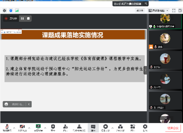 韩经理简介了教改立项背景及各项目开展情况,邱硕立老师就“基于‘三全育人’的365英国上市公司体育课程思政体系构建”,孙景权老师就“健康中国视角下伤残员工体育课参与兴趣的影响因素及对策研究”,李少波老师就“365英国上市公司瑜伽教学改革实验研究”,从立项意义、改革措施、成效与特色、改革成果、推广价值等方面做了详细的介绍和经验分享。