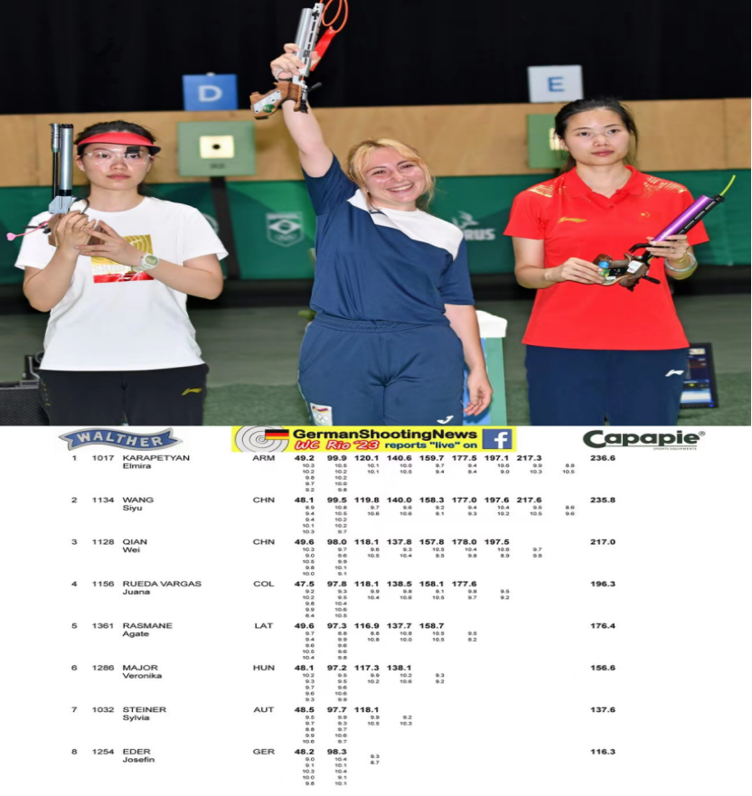王思雨同学于国内时间9月9日晚饭后从北京出发,飞了八个半小时到迪拜转机里约热内卢,北京时间11日清晨抵达巴西。由于本次赛场超两万公里,经历了转机、机上休息不好、倒时差、巴西昼夜温差大等情况导致着凉,于12日起开始发烧。为了不影响比赛,未服用任何药物,虽状态不好,力量发软,但依然坚强的站上了赛场,于9月14日完成了比赛。多轮角逐下来,王思雨同学的赛场思想保持较为干净,均以抓技术程序为主。由于决赛倒数第二发子弹开始前,出现突发情况精力未能及时收回导致打出远弹,此时成绩依然领先第二名0.1环。但决赛最后一发,亚美尼亚选手打出10.5环,王思雨同学受上一发子弹影响未能专注技术抓好主线,最终相差0.8环获得亚军。