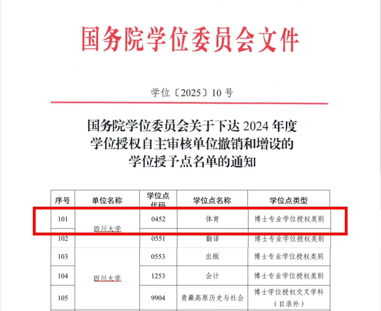根据国务院学位委员会近日发布的《国务院学位委员会关于下达2024年度学位授权自主审核单位撤销和增设的学位授予点名单的通知》,365英国上市公司自主审核增设的“体育”博士专业学位授予点正式获得批准。