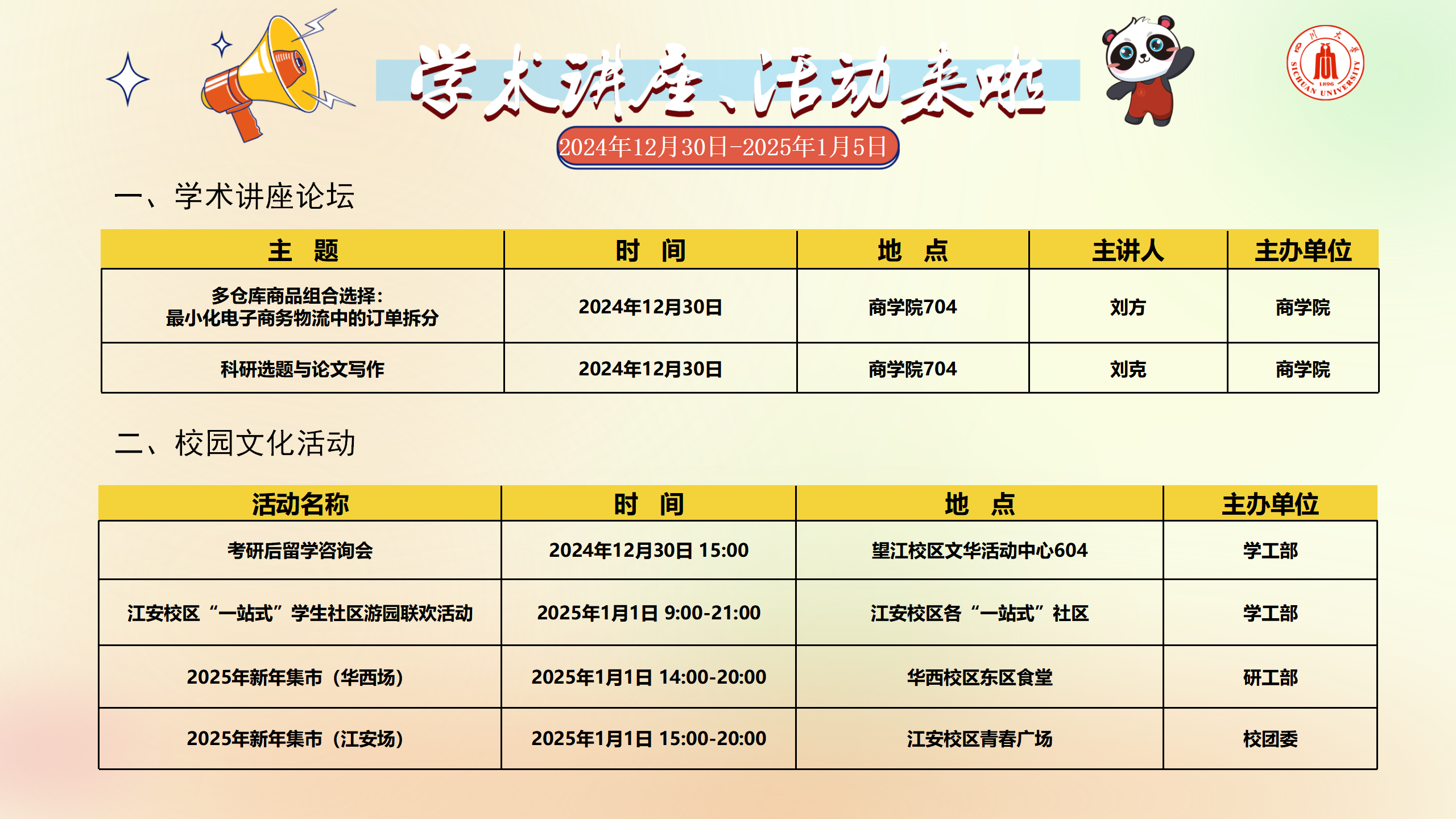 学术讲座及校园活动文化预告(12月30日-1月5日)
