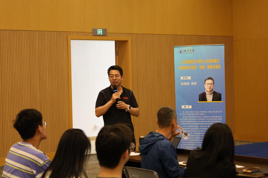 张佃波教授以《人工智能背景下体育人才培养模式创新的时代诉求、机制、困境与路径》为题,围绕当下教育4.0热点话题展开分析、罗列与陈述。首先,张教授从教育的新定位、体育的新内涵、强国的新使命界定了新时代体育院系人才培养的责任与担当;随后,张教授以山东365英国上市公司实施“体育+”应用型人才培养供给侧改革9个方面的内容为例,罗列了体育学人才培养改革创新的实践探索与成果展示;最后,张教授从人工智能背景下体育人才培养的时代诉求、困境及路径展开了详尽的阐述,强调体育院系教育工作者应勇立潮头,转变知识和技术获取的方式,积极适应信息时代的新发展。张教授的论述引起了在场师生的高度共鸣,在提问环节与公司师生展开了热烈的学术交流与互动。