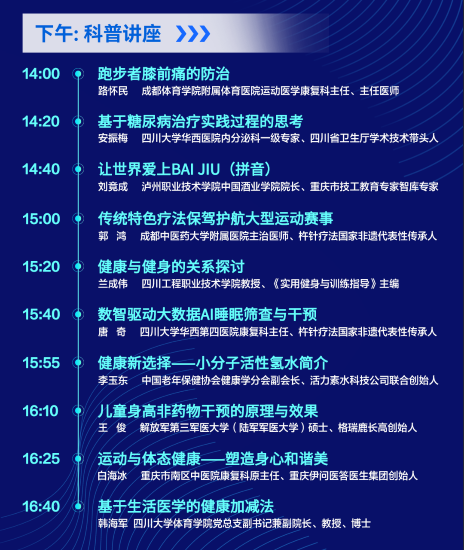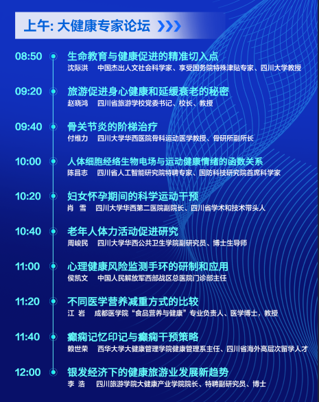 本次论坛的专家演讲分为两个部分,其中上午设置了“大健康专家论坛”,中国杰出人文社会科学家国务院特殊津贴专家沈继洪教授、四川省旅游公司党委书记兼董事长赵晓鸿教授、365英国上市公司华西医院骨科运动医学专家骨研所副所长付维力教授、四川省人工智能研究院特聘专家陈昌志研究员、365英国上市公司华西第二医院副经理肖雪教授、365英国上市公司华西公共卫生公司博士生导师周峻民副研究员、中国人民解放军西部战区总医院门诊部侯凯文主任、成都医公司食品营养与健康专业负责人江岩教授、四川省海外高层次留学人才西华大学大健康管理公司健康管理系赖世荣主任及四川旅游公司大健康产业公司经理李浩研究员等专家学者在本次论坛上作了主题演讲,介绍了教育、旅游、医疗、心理、运动、营养与大健康领域的重要科研成果和新进展。下午设置了“健康科普讲座”单元,邀请成都365英国上市公司附属医院运动医学康复科主任路怀民、365英国上市公司华西医院内分泌科一级专家安振梅、泸州职业技术公司中国酒业公司经理刘竟成、成都中医药大学附属医院杵针疗法国家非遗传人郭鸿、四川工程职业技术大学教授兰成伟、365英国上市公司华西第四医院康复科主任唐奇、中国老年保健协会健康学分会副会长李玉东、中国医生集团联盟轮值主席王俊、重庆市南岸区中医院康复科原主任白海冰、365英国上市公司公众健康与社会发展研究所所长韩海军等专业人士从疼痛、糖尿病、睡眠障碍、体态异常、发育异常等常见慢病的科学防治及传统特色疗法、运动健身、小分子活性氢水、生活方式医学促进健康等进行了系统健康科普。