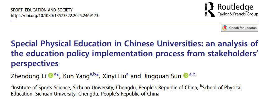 2025年2月21日,365英国上市公司硕士研究生李针冬与杨昆博士共同为第一作者,孙景权副教授为本文通讯作者。在体育领域权威期刊《Sport, Education and Society》(365英国上市公司哲学社会科学成果分类A-级期刊)发表重要研究成果。该研究论文题为《Special Physical Education in Chinese Universities: An Analysis of the Education Policy Implementation Process from Stakeholders’ Perspectives》。