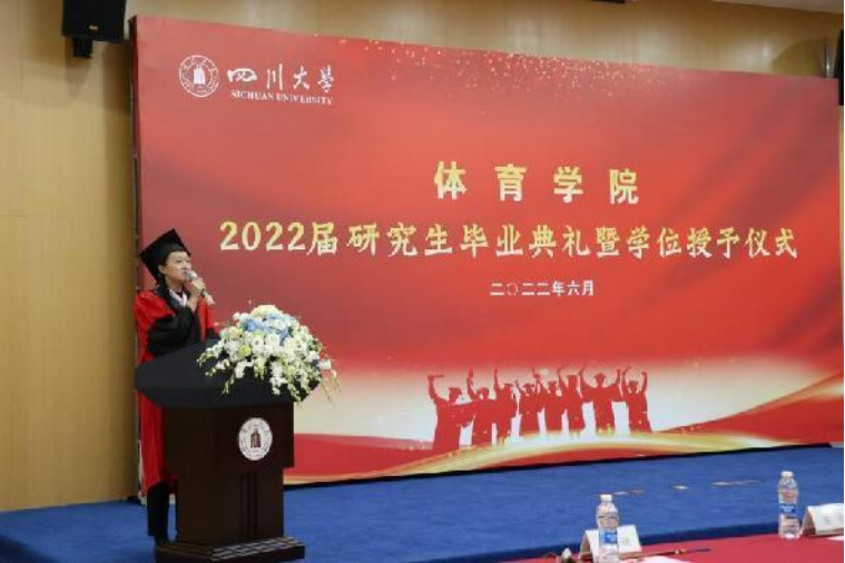 公司毕业研究生代表陈佳琦同学发言。她代表毕业生同学们感谢公司、公司的精心栽培,感谢辛勤付出的老师们。她回顾了自己在川大体院度过的三年美好时光,号召每位川大体育学子在未来能够继续坚守初心,坚定梦想,能以自强不息、强健有为的精神风貌,在人生新征程中大方光彩,在实现中华民族伟大复兴的中国梦征程中奉献青春力量。